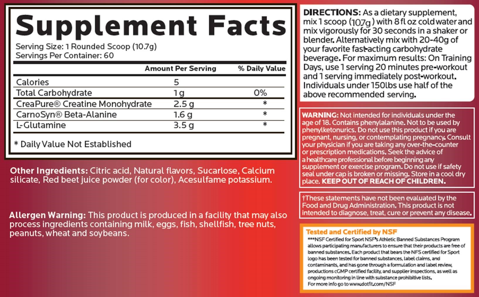 Below is the Supplement Facts panel with the updated formula. As you can see it is a great stand-alone product you can adjust dosing as needed but more importantly, you can add more creatine (dotFIT CreatineMonohydrate) or more glutamine (MuscleDefender) as desired during loading or highly stressful training.